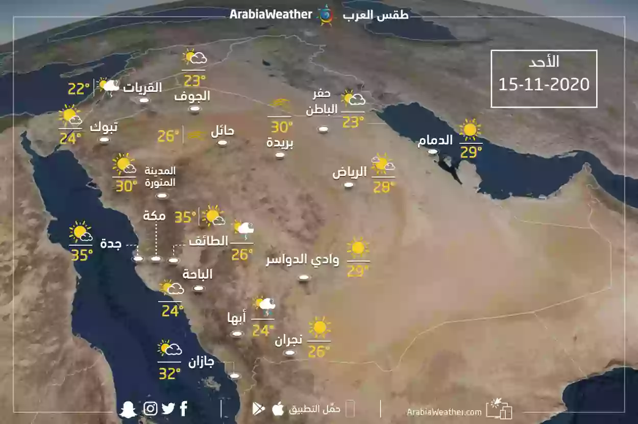 | الدمام | 39 درجة مئوية | 27 درجة مئوية | حار ورطب | 15-25 كيلومترًا في الساعة | 50-60% |