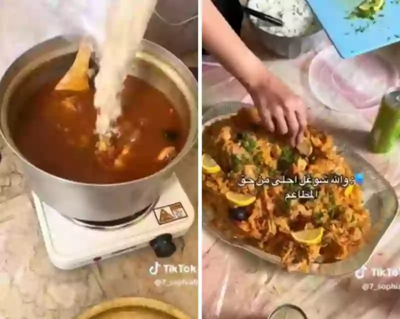 يمكن رؤية إحدى الفتيات وهي تقوم بوضع مكونات الكبسة داخل إناء على موقد صغير، وبعد انتهائها من الطهي، وضعت الكبسة بعناية في صحن التقديم وقامت بتزيينها بقشور الليمون.